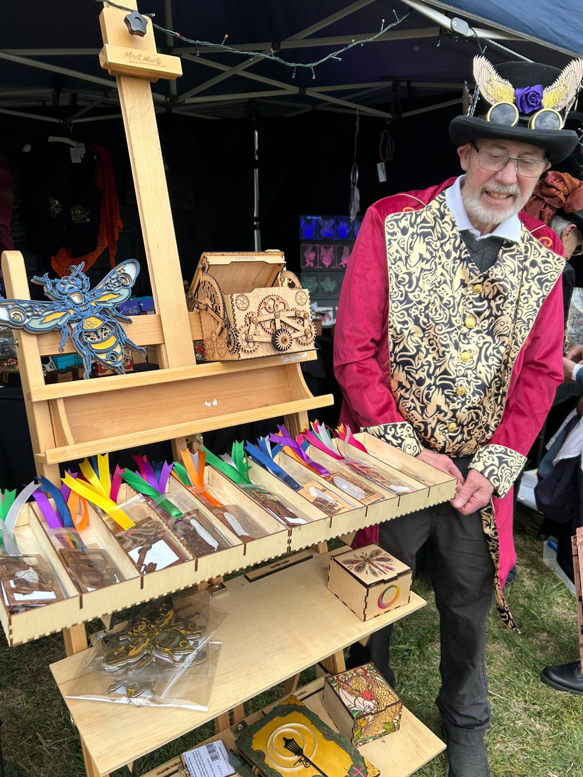 Steampunk storage game box’s for Dungeons and dragons., and many others. Steampunk phone stand chargers. Steampunk hospitality cutting boards , coasters and trays. Steampunk paper weights that are LED back lit. Steampunk fob watches and compasses . Large range of hand made steampunk broaches and Jewellery.